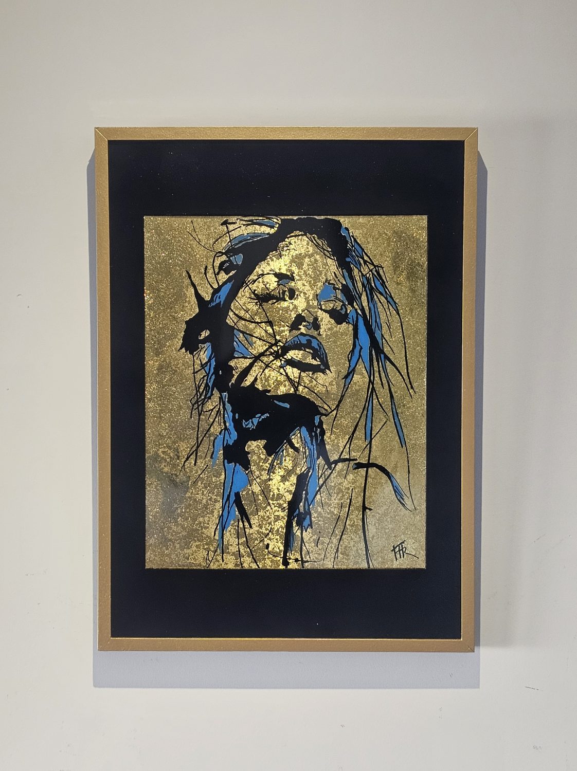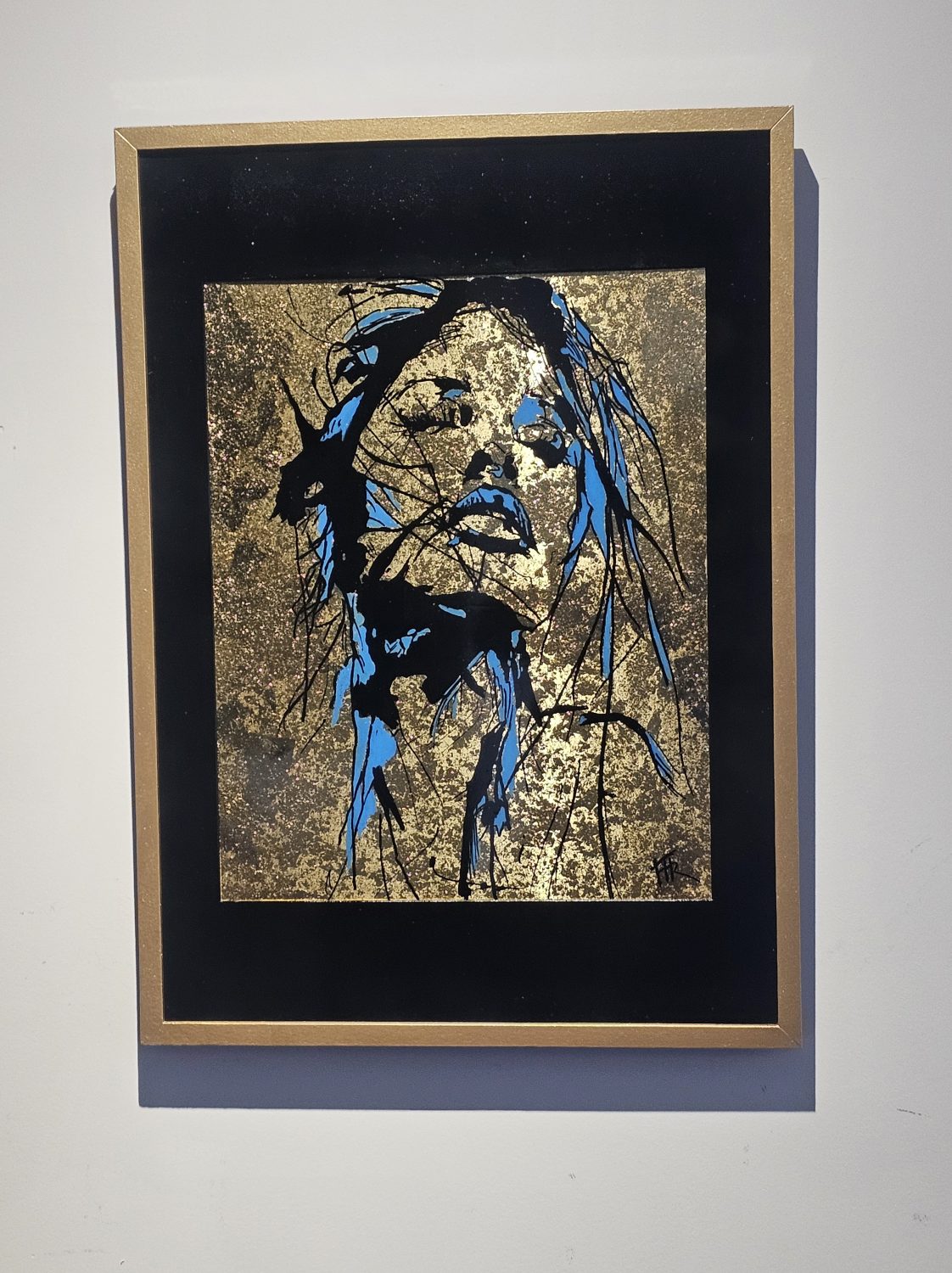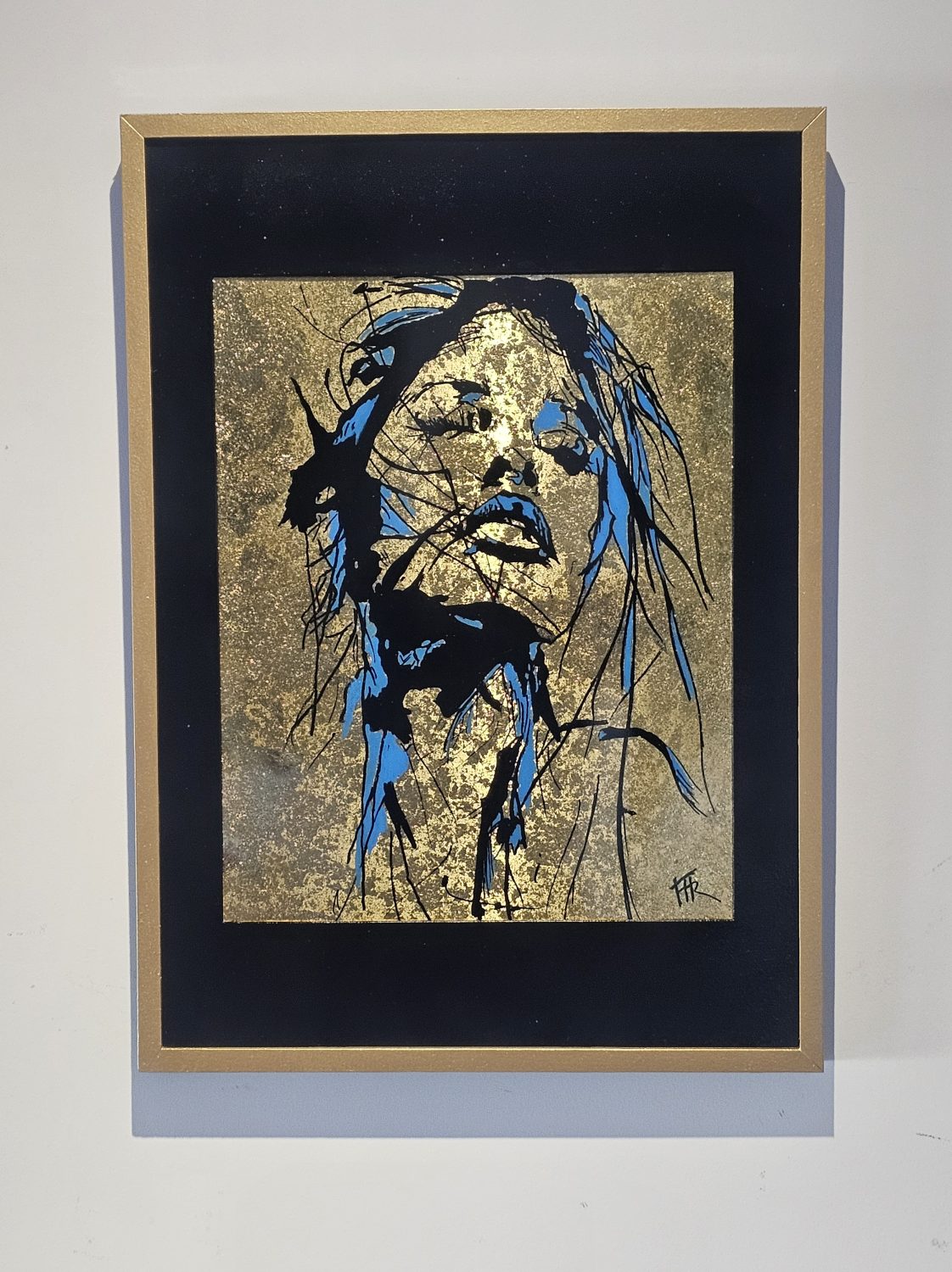 Technique: Acrylique et posca sur toile tendue résine epoxy et feuille d’or