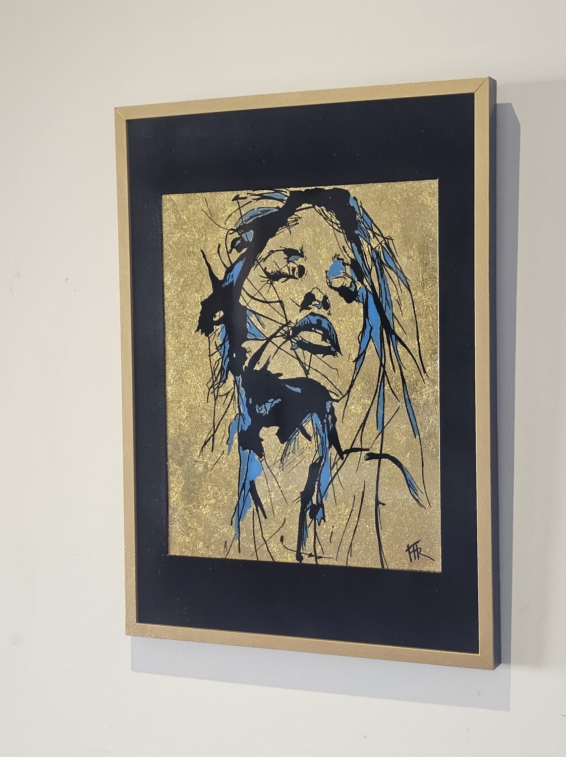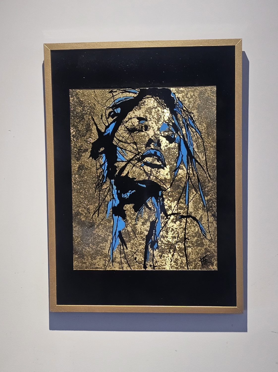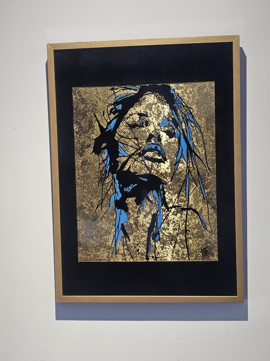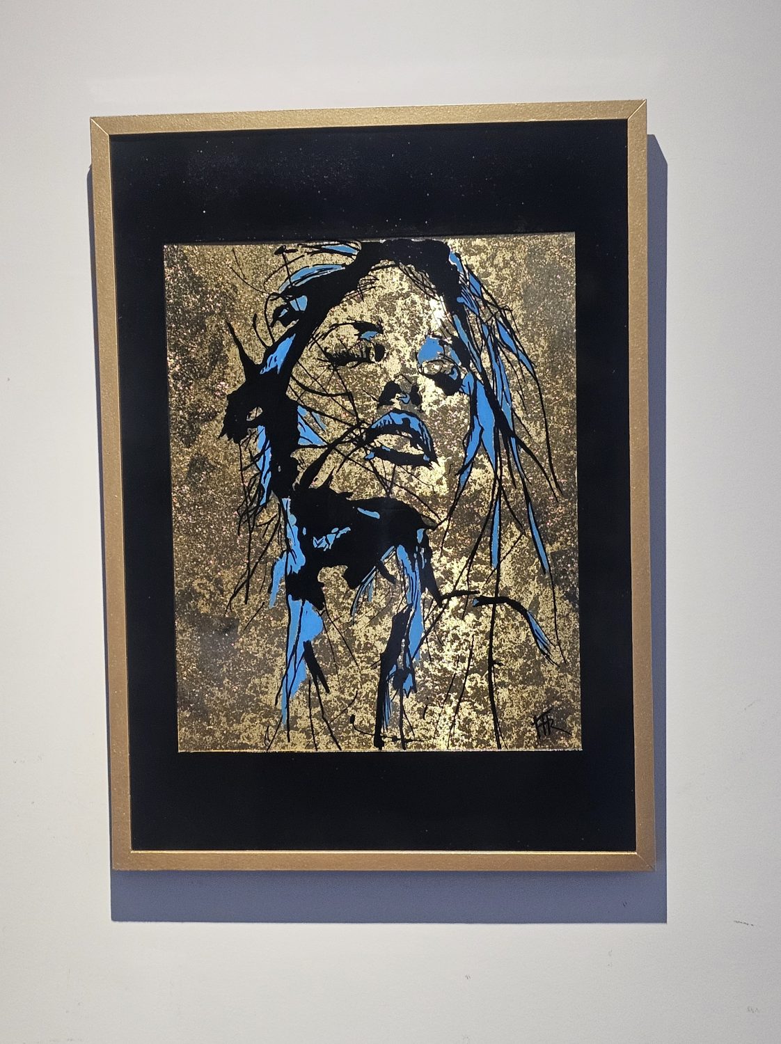 Technique: Acrylique et posca sur toile tendue résine epoxy et feuille d’or