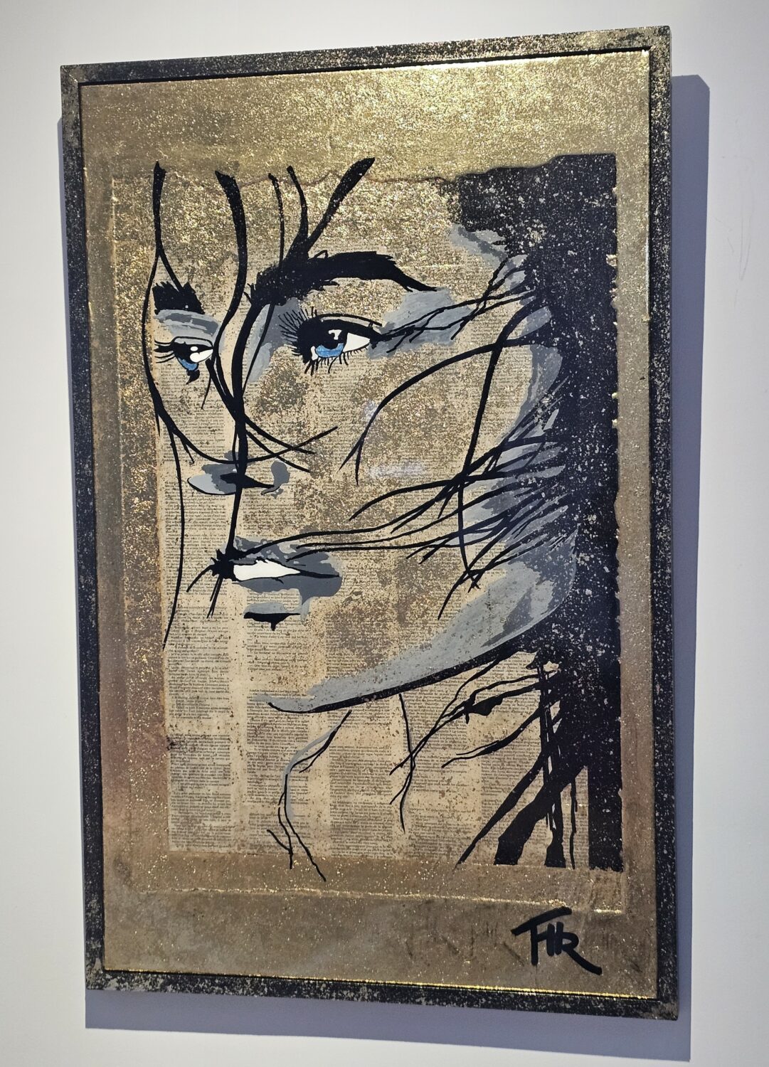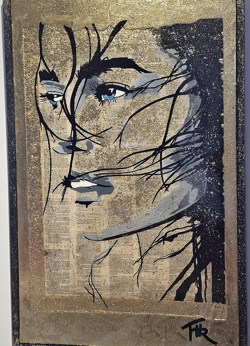 Technique: Acrylique posca collage sur toile tendue avec feuille d’or et résine époxy