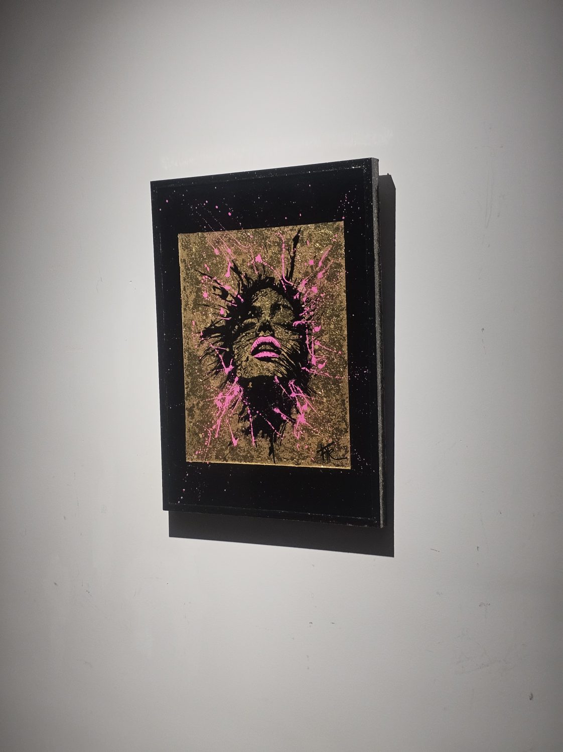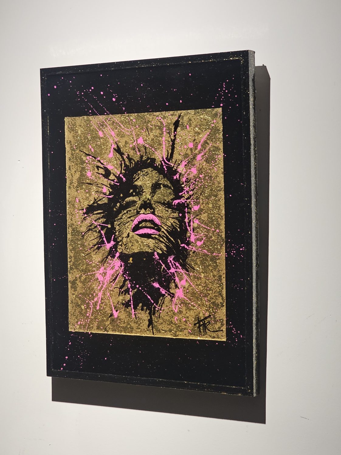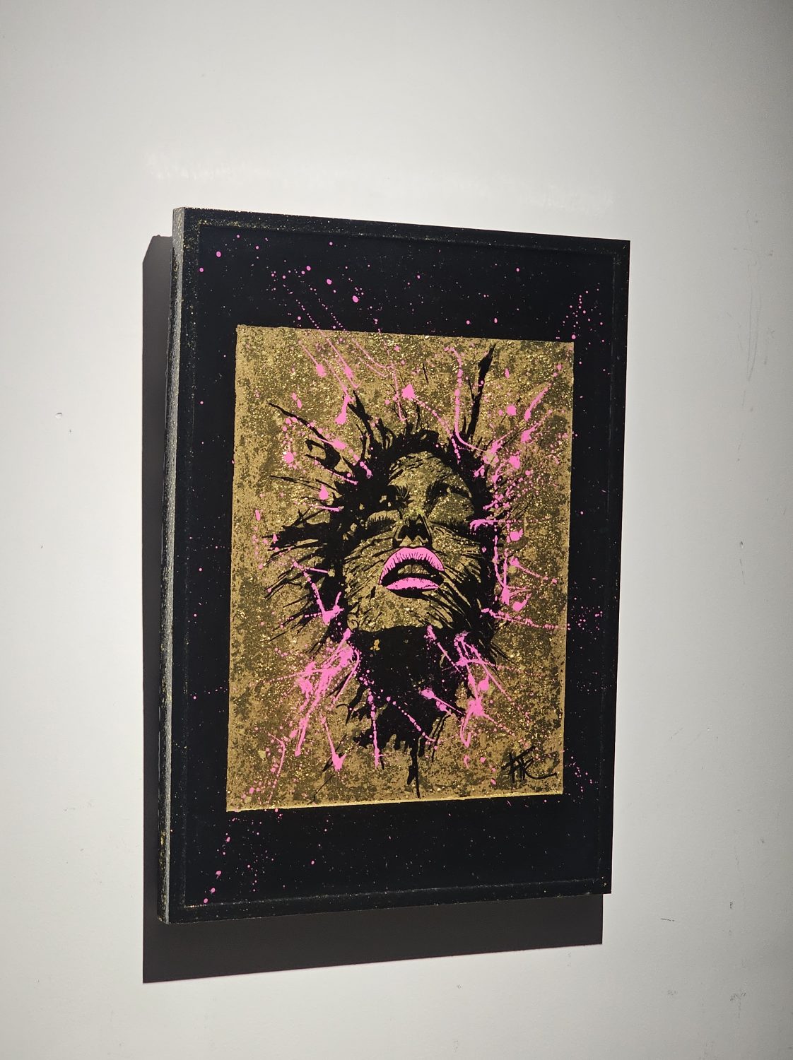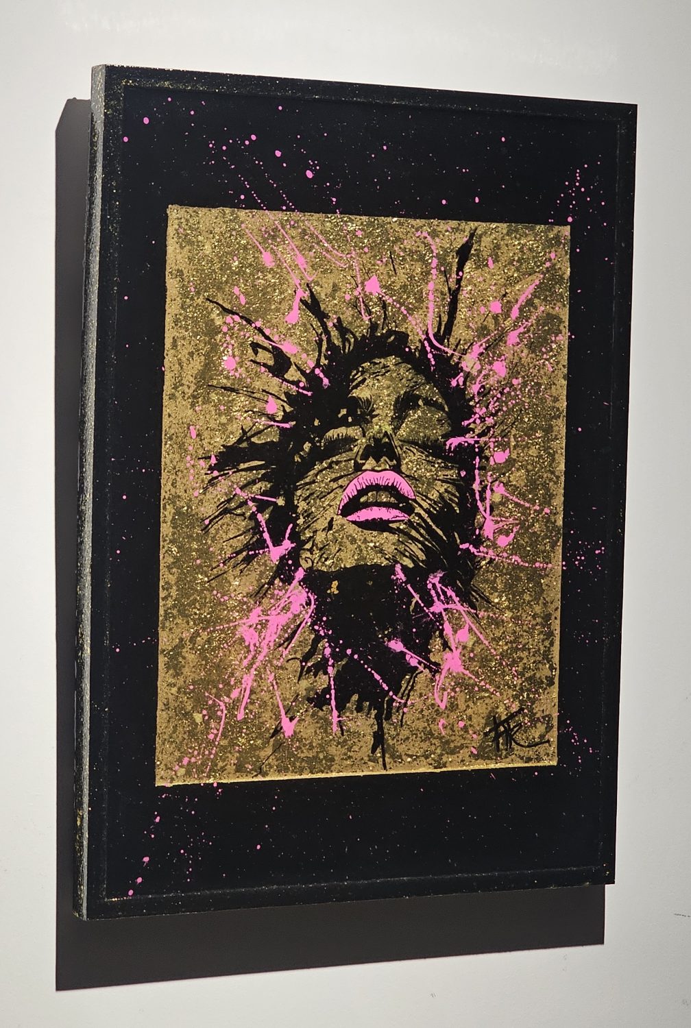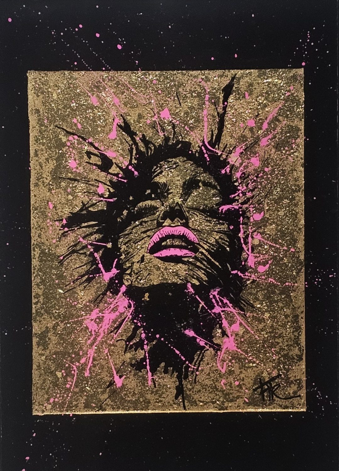 Technique: Acrylique et posca sur toile tendue résine epoxy et feuille d’or
