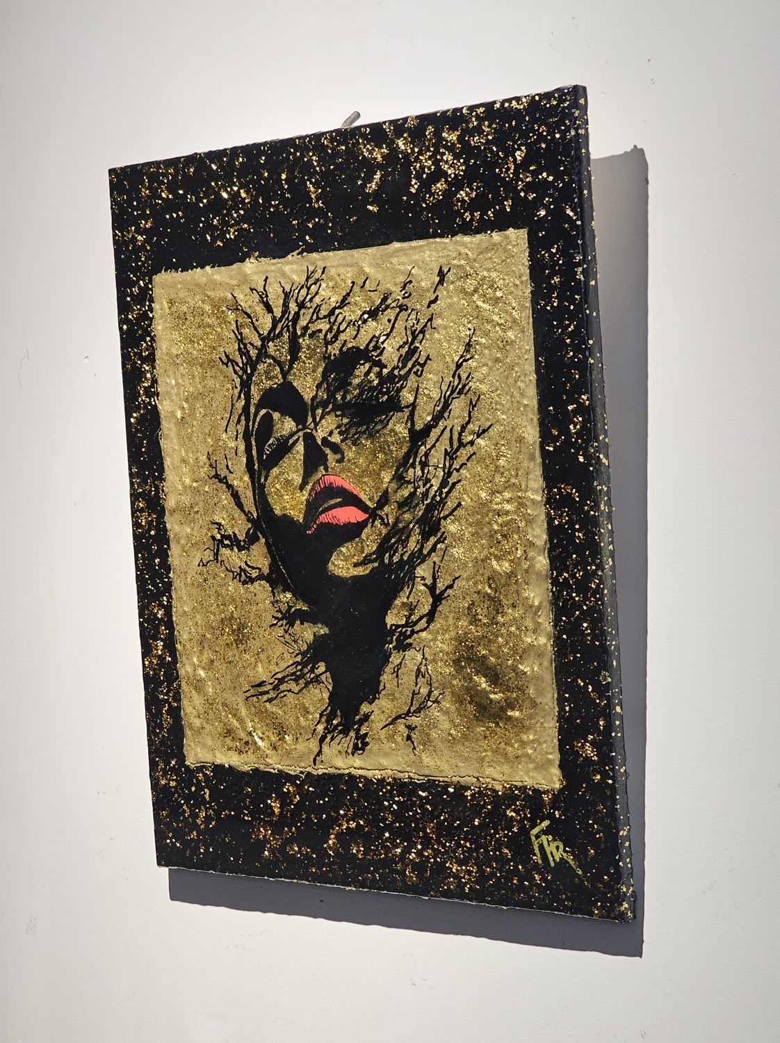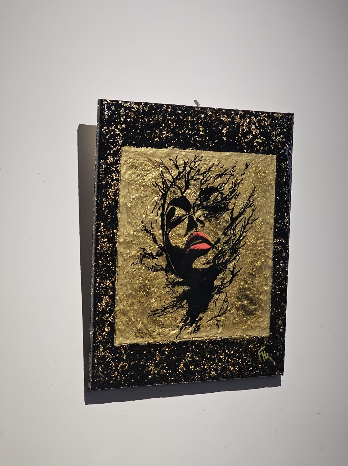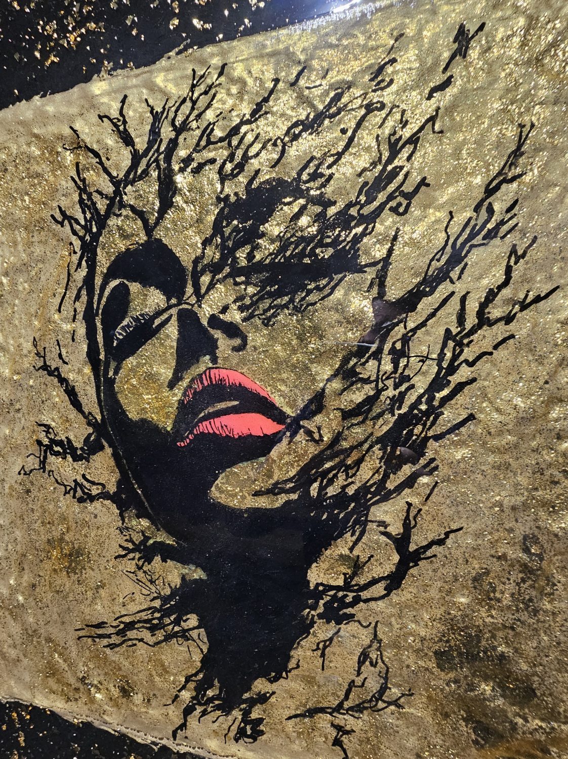 Technique: Acrylique et posca sur toile tendue résine epoxy et feuille d’or