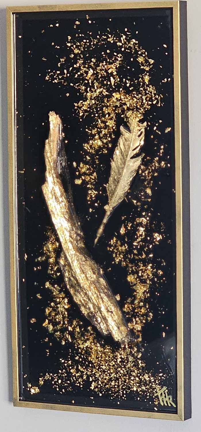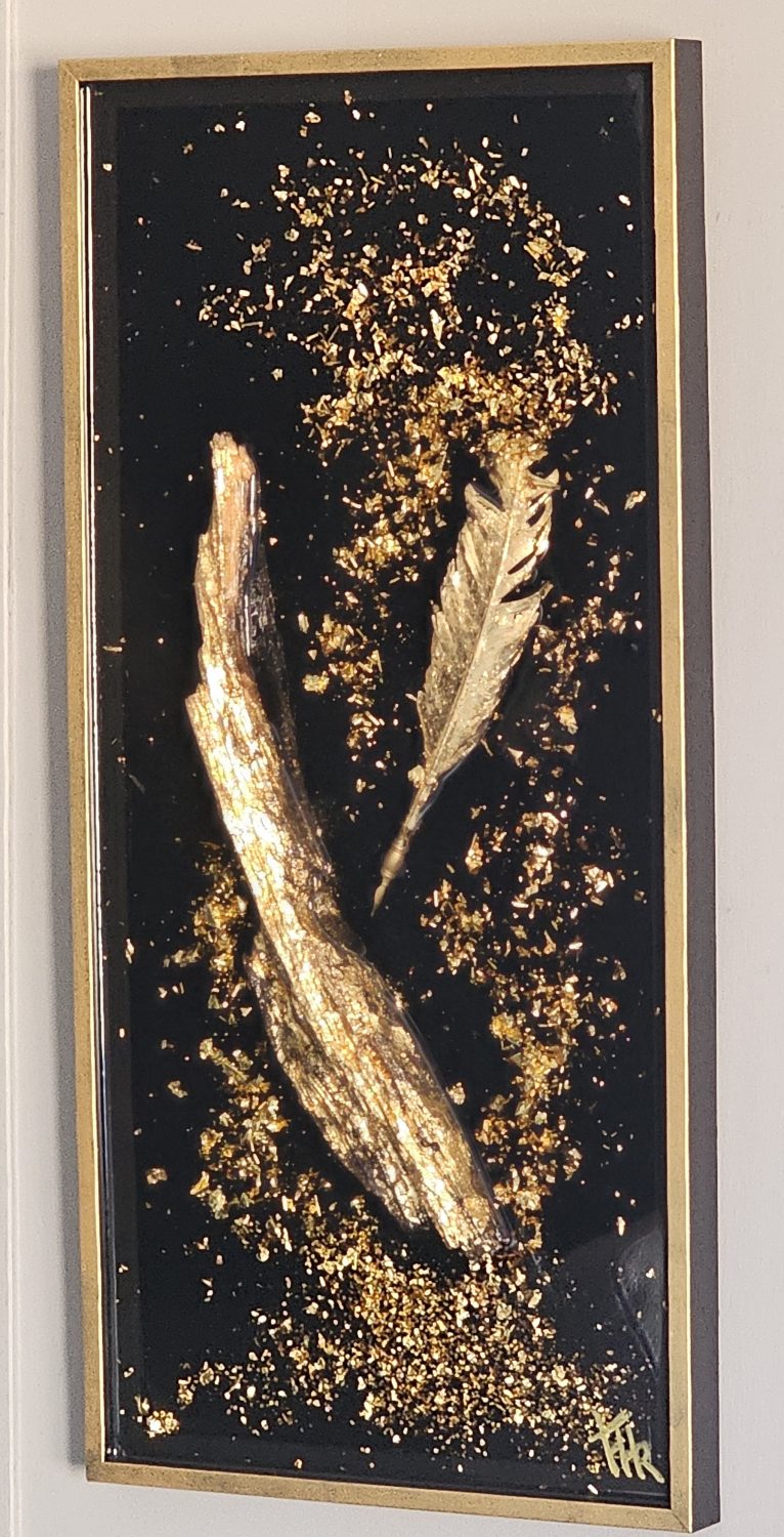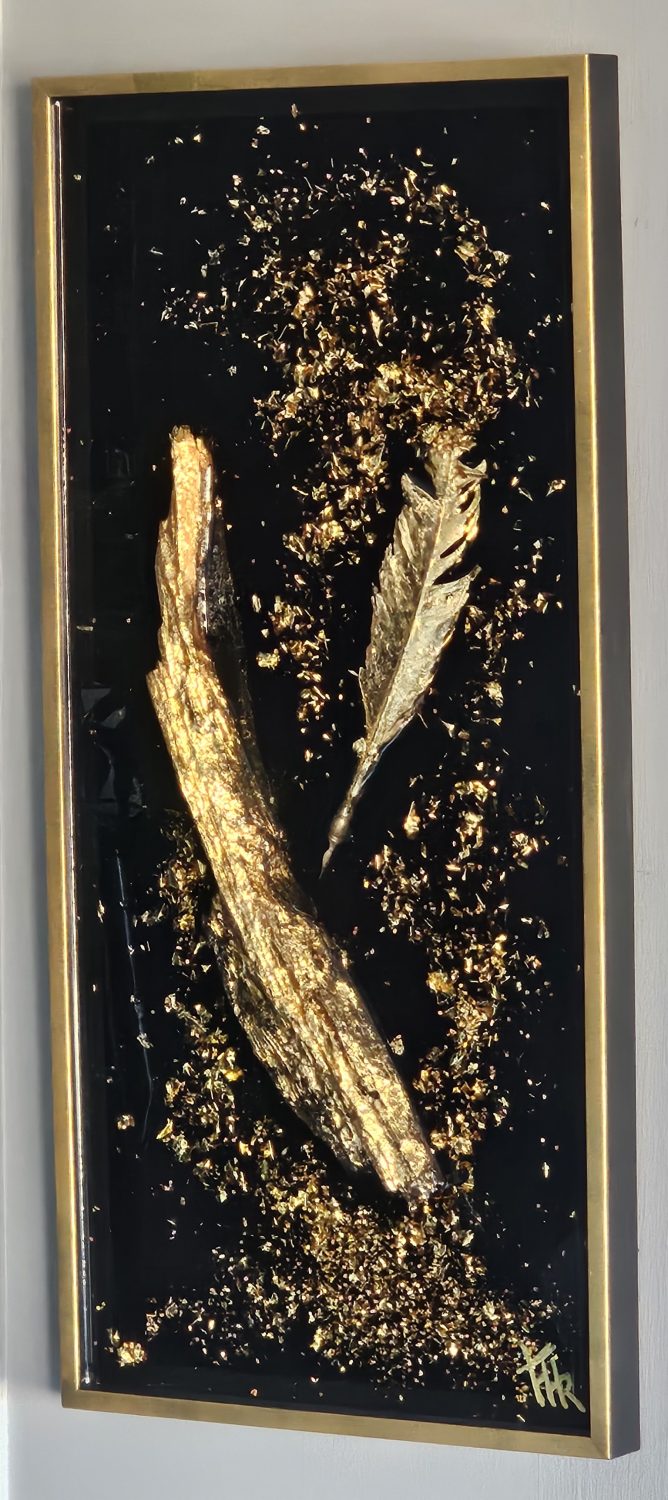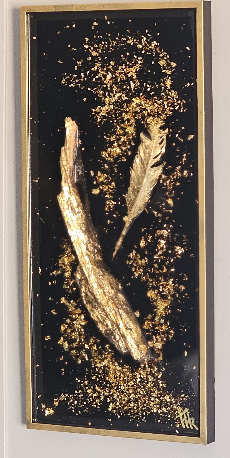 Technique: peinture acrylique Posca feuille d’or et résine époxy sur support bois