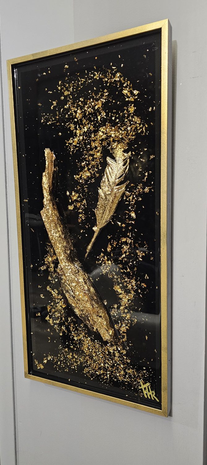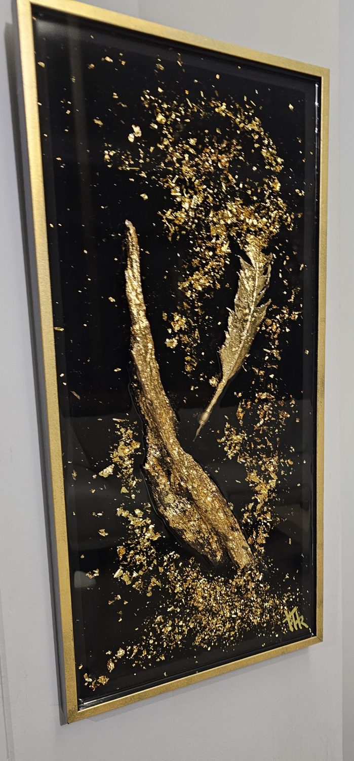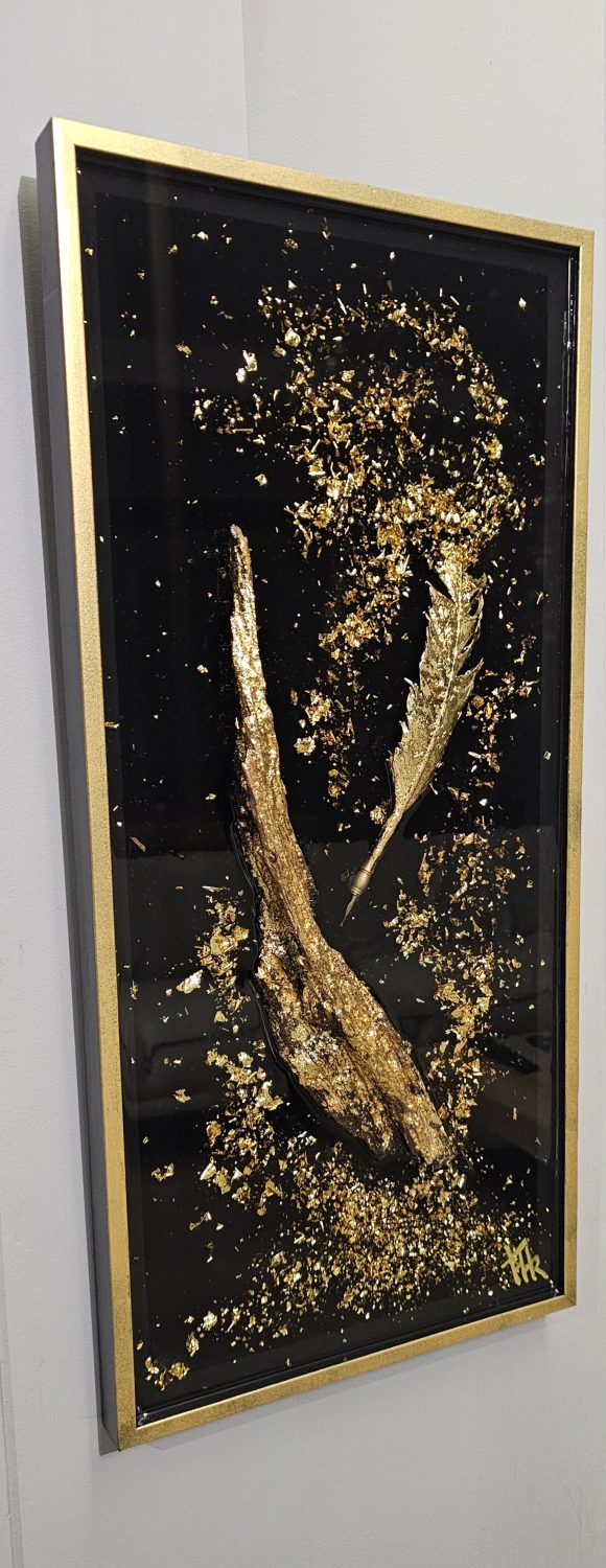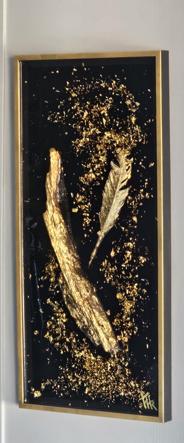Technique: peinture acrylique Posca feuille d’or et résine époxy sur support bois