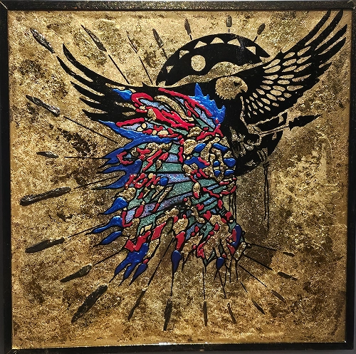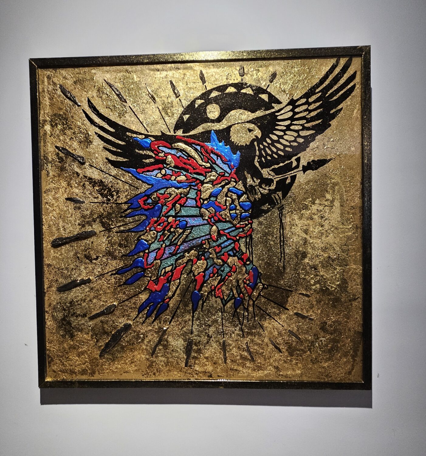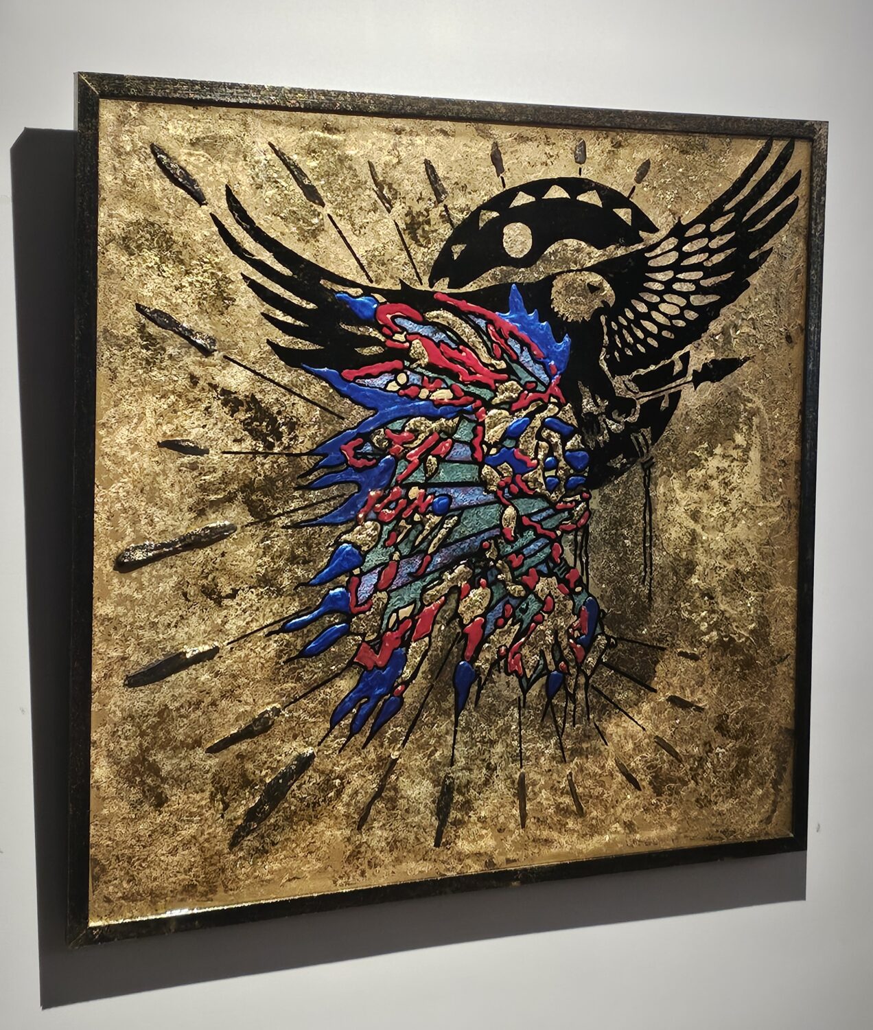 Technique: Acrylique sur bois, Posca, feuilles d’or et résine époxy